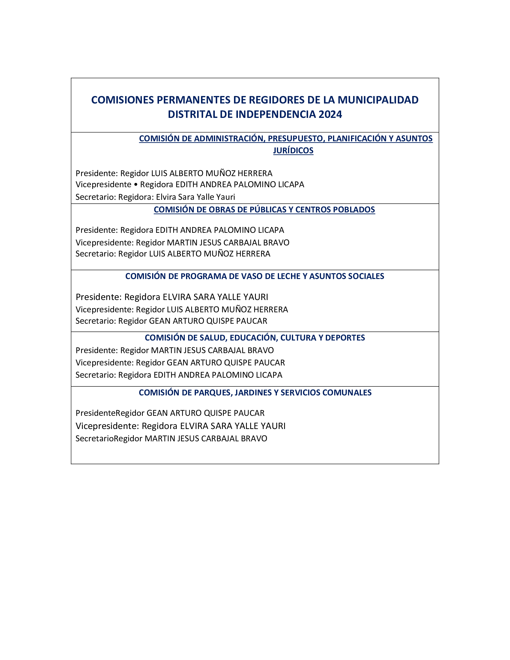 La Comisión de Regidores, son los Órganos Consultivos, de coordinación, y son instancias de deliberación previa que señala el Concejo Municipal, tiene la capacidad de fiscalizar, ejecutar y observar los dictámenes y proyectos que juzquen conveniente en las áreas de su responsabilidad de servicios públicos y de gestión municipal.
