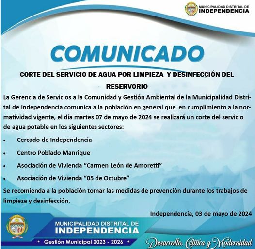 COMUNICADO: HOY CORTE DEL SERVICIO DE AGUA POR LIMPIEZA Y DESINFECCION DEL RESERVORIO