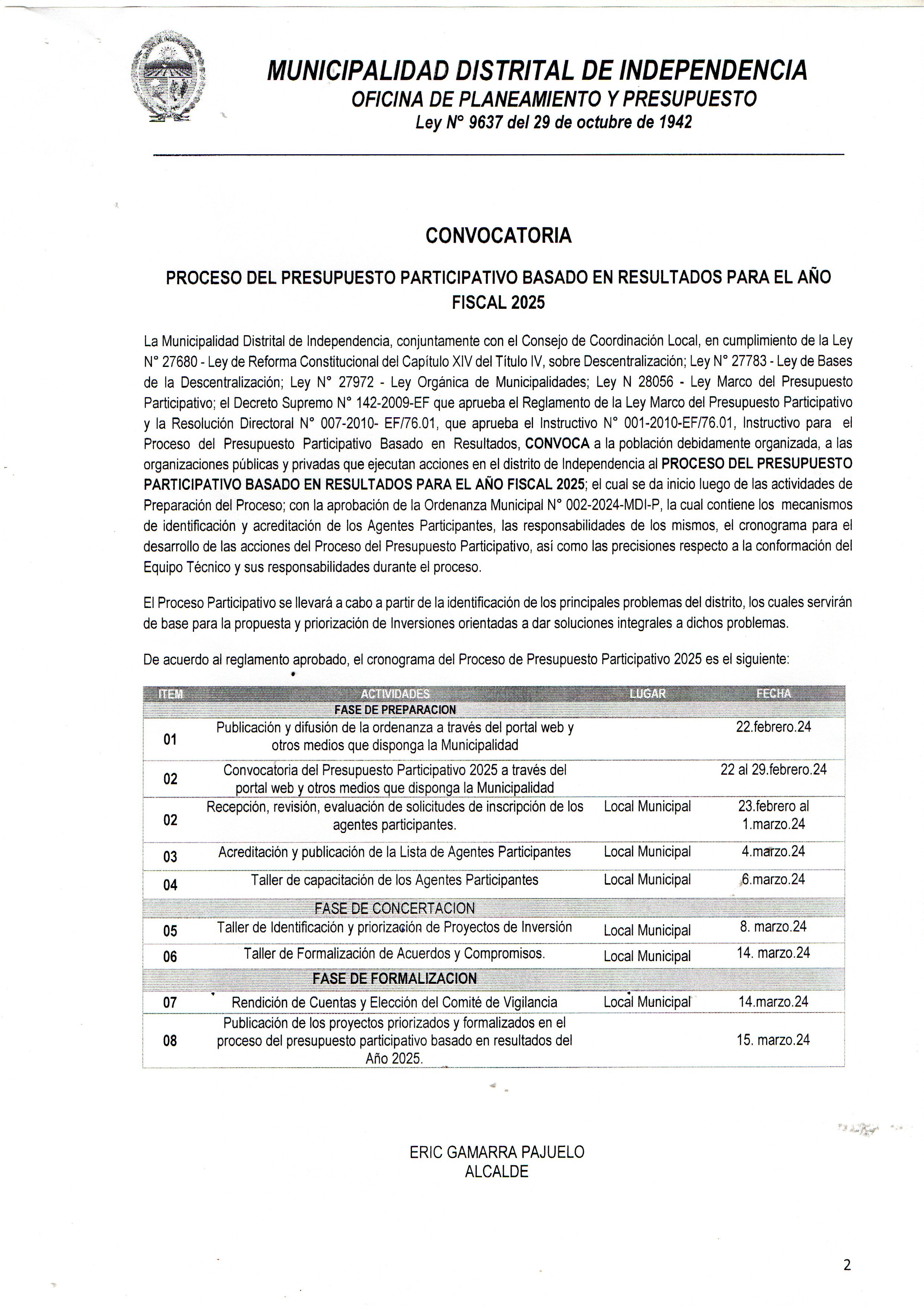 MUNICIPALIDAD DISTRITAL DE INDEPENDENCIA - OFICINA DE PLANEAMIENTO Y PRESUPUESTO